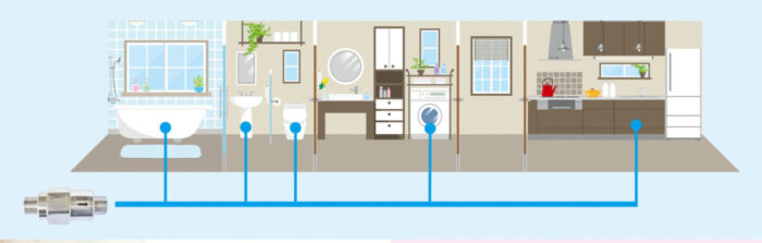 キッチン、トイレ、お風呂、洗濯、洗面所等、自宅の水が全てウルトラファインバブルの水になります。
