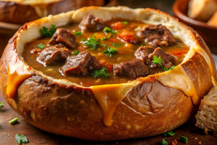 こんがり焼いたパンの器に、長時間煮込んだ牛肉がほろりと崩れる”とろとろビーフシチューをたっぷり詰めました。
