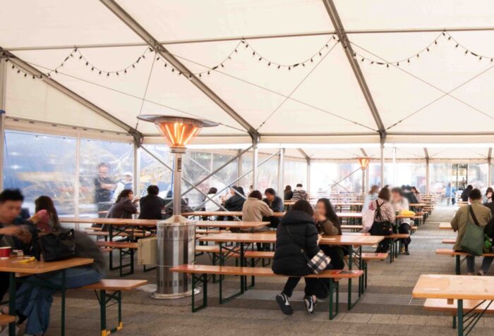 約200名が利用できる防風テントにはストーブを設置。冷え込む日でも安心して食事を楽しめる環境をご用意しています。
