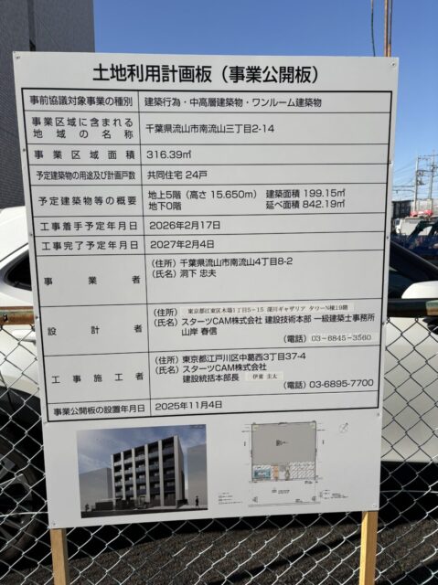 【南流山駅近】南流山3丁目、現在駐車場の場所にワンルームマンションの建設計画が出ていました。