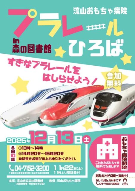 12/13(土)流山市立森の図書館で「プラレールひろば」開催。おもちゃ病院も開院!壊れたおもちゃがあったら直してもらおう◎