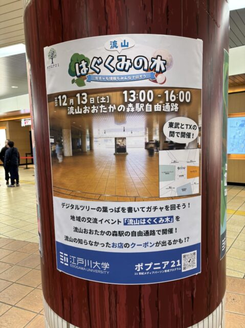 12/13(土)流山おおたかの森駅自由通路にて江戸川大学学生さんによる地域交流イベント「流山はぐくみの木〜ガチャも情報もみんなで回そう〜」が開催。