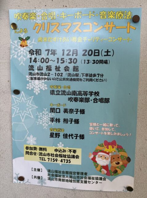 12/20(土)流山福祉会館にて「クリスマスコンサート~歳末たすけあい募金チャリティコンサート~」が開催されます。
