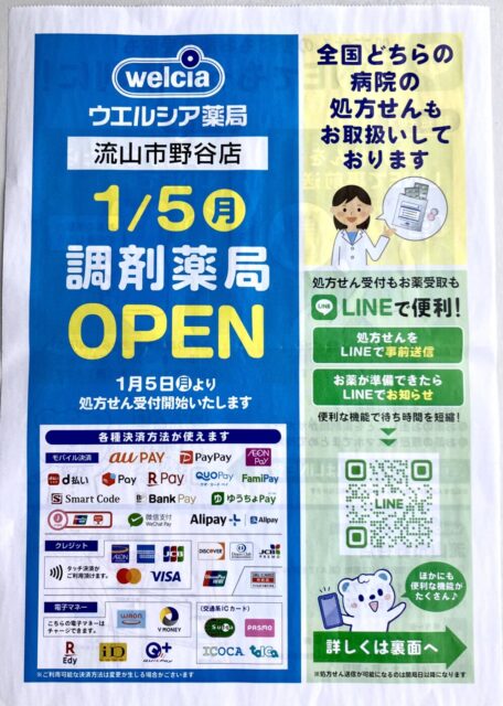 1/5(月)ウエルシア流山市野谷店に「調剤薬局」がOPEN!