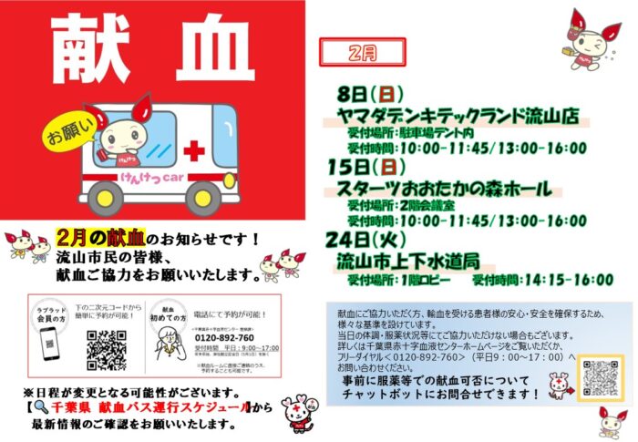 流山市内で行われる2月の献血のスケジュールが発表されました。