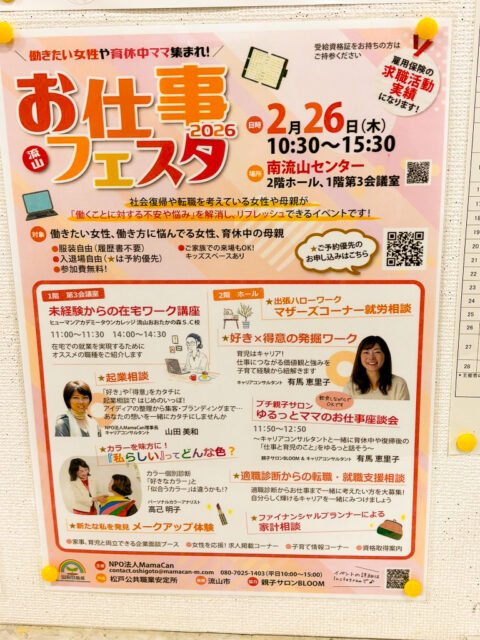 2/26(木)南流山センターにて、働きたい女性などが対象の「お仕事フェスタ2026」が開催。