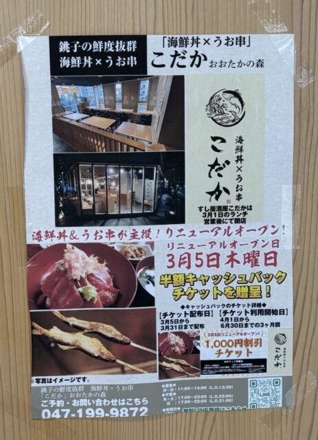 流山おおたかの森駅近くの「鮨処こだか」が3/1(水)閉店、3/5(木)「うお串と海鮮丼」のお店としてリニューアルOPEN!