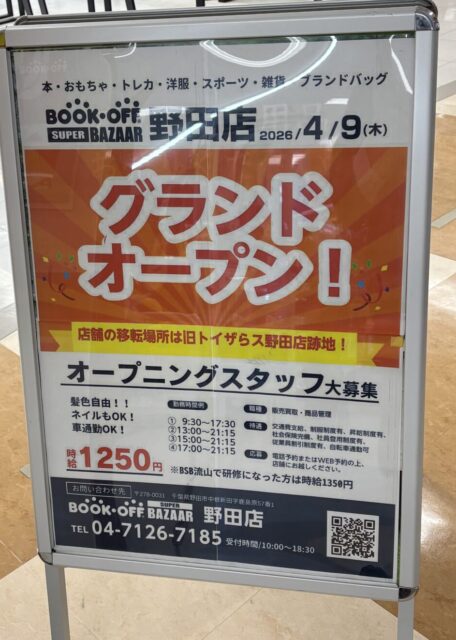 【開店】野田市イオンノア店近くに「BOOKOFF SUPER BAZAAR 野田店」が4/9(木)オープン!