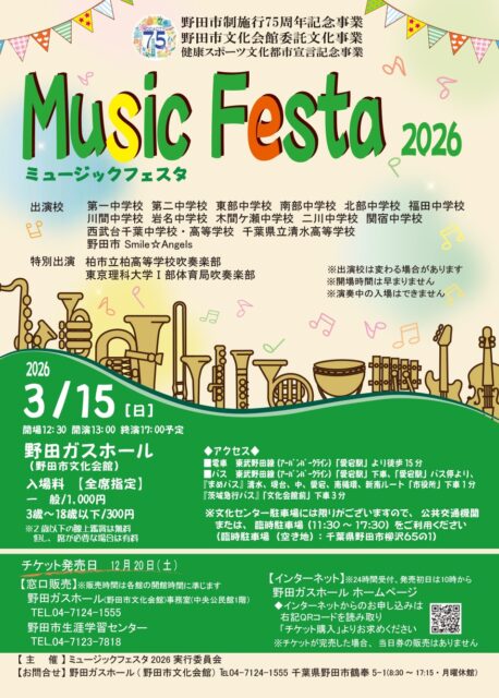3/15(日)野田市文化会館にて「Music Festa 2026」が開催されます。
