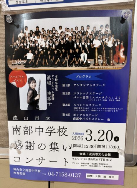 3/20(祝)流山市文化会館にて「流山市立南部中学校 感謝の集いコンサート」が開催